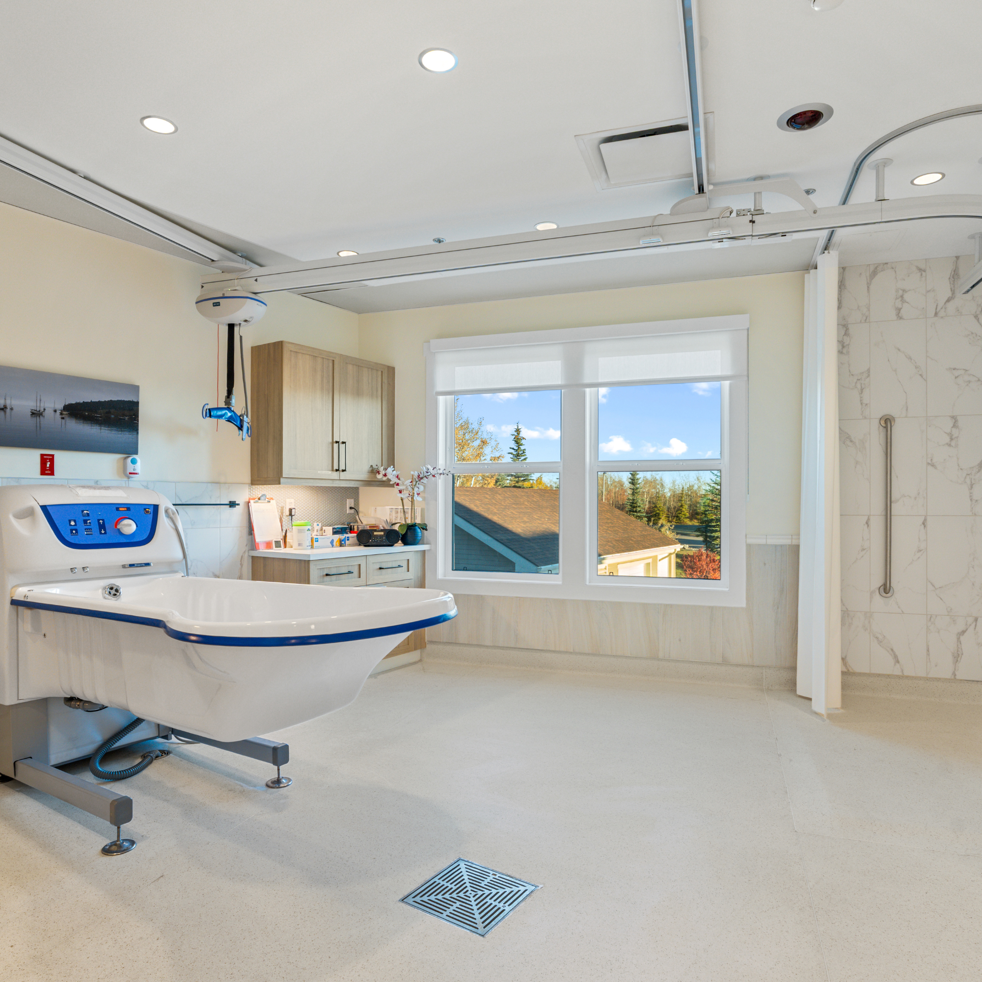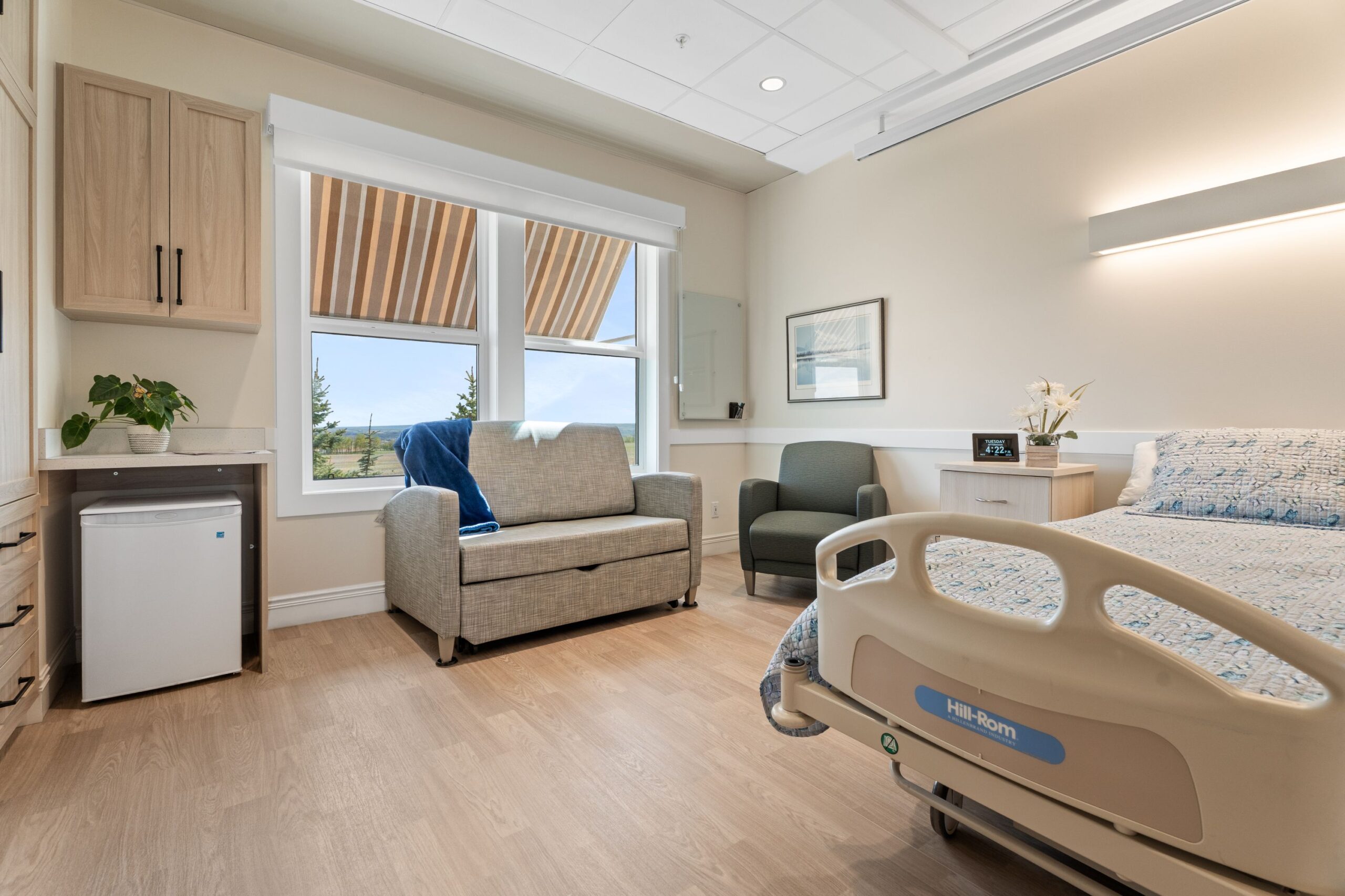 Patient rooms are bright, private, spacious and tastefully decorated, featuring an electric bed, private phone, closets, satellite TV, Wi-Fi, fridge and a dedicated space for personalizing the room with familiar decor and objects to make patients spaces feel like home.