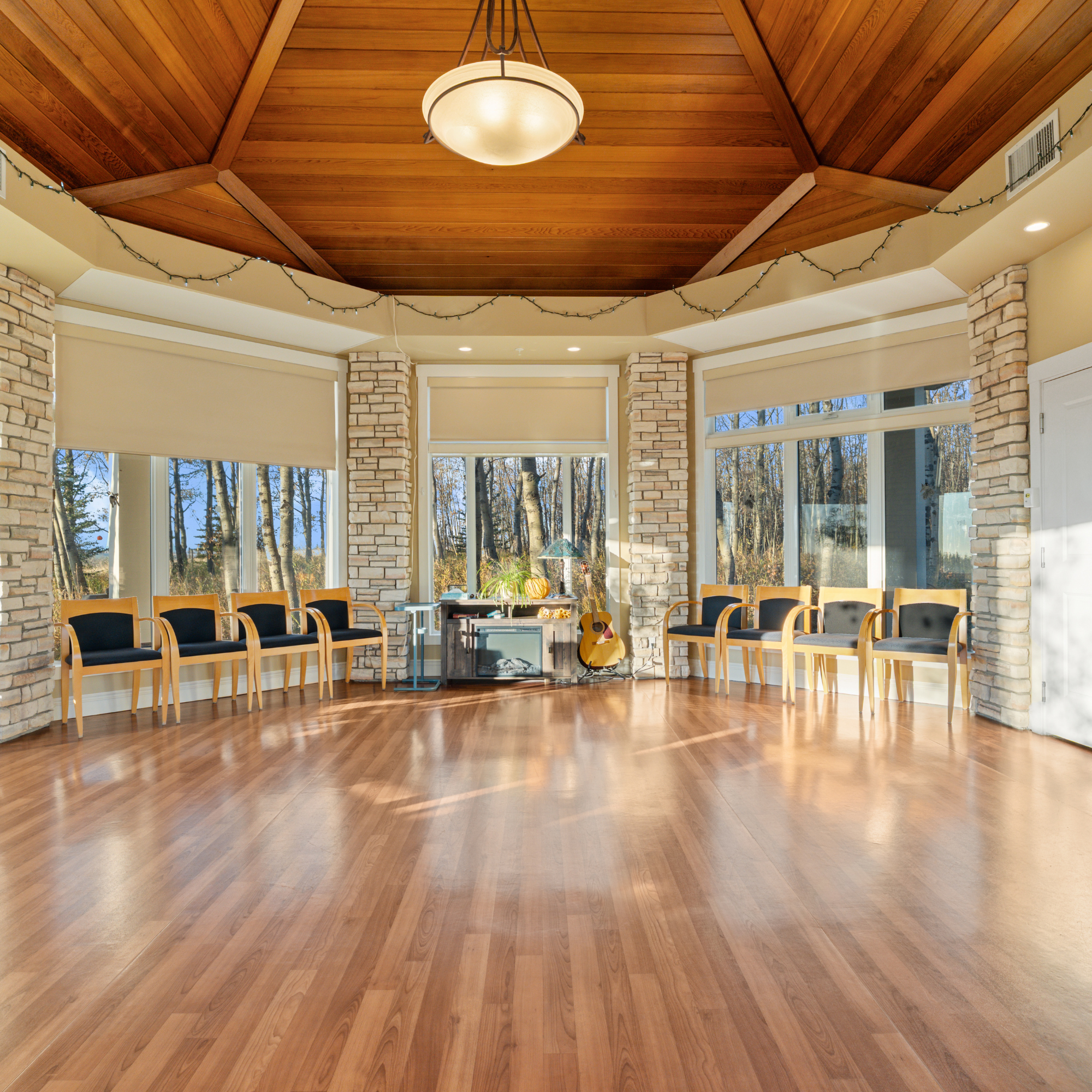 Nestled in the foothills countryside, our eight bed, 13,500 square foot facility is located 1.5 km north of Okotoks on an eight-acre parcel of land with beautiful surrounding mountain views and wooded walking paths for all guests and patients to enjoy.